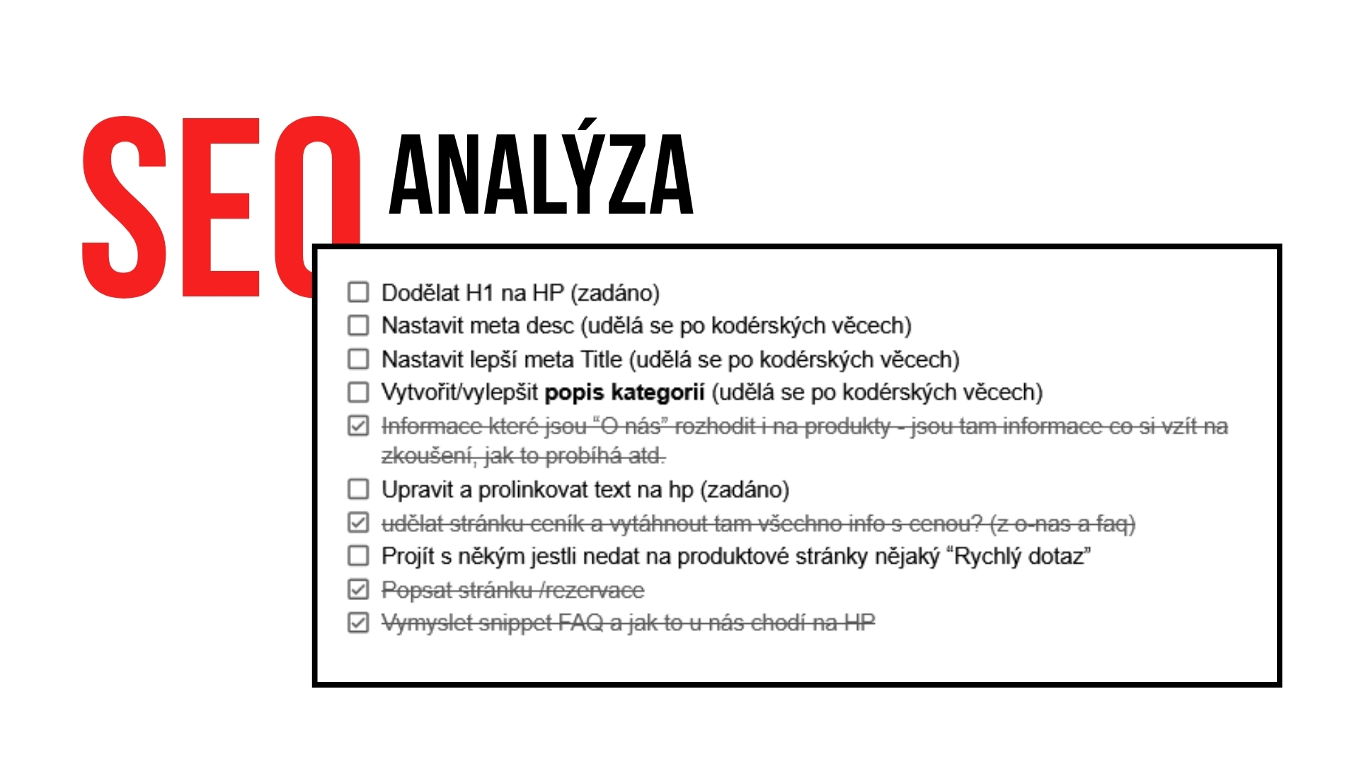 Ty jsme samozřejmě zpracovali i tady. Nicméně s ohledem na omezený rozpočet jsme těmto krokům věnovali spíše méně času než více. Na obou analýzách by se totiž dala spálit většina rozpočtu a na aktivity, které přinesou jednoznačný efekt pro Google, by nezbyly ani čas, ani peníze.