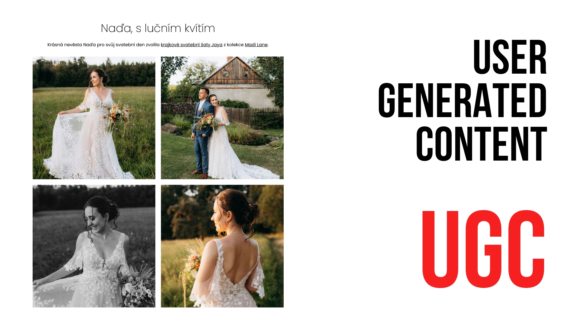 Z části jsme připravili novou UGC (tzv. User Generated Content, obsah generovaný uživateli) sekci pojmenovanou „Galerie nevěst“. Klientka do ní vkládá jakýkoliv obsah, krátké zprávy a hodnocení, ale především fotky, které jí poslaly ze svých svateb nevěsty se zapůjčenými šaty. A my si myslíme, že v tomto případě jde o jeden z nejlepších způsobů, jak se na internetu prezentovat a budovat vlastní autoritu.