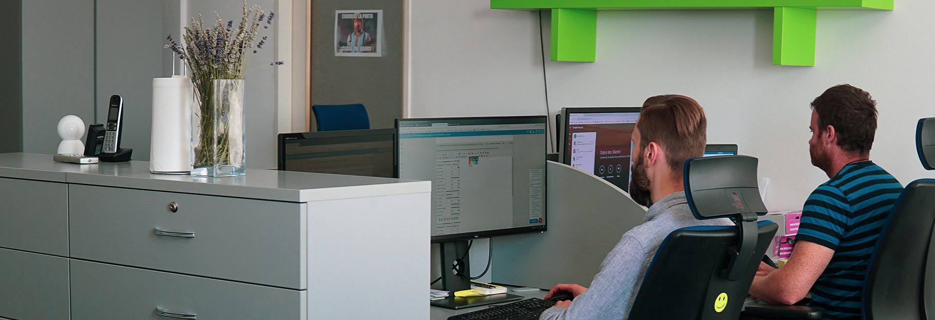 V jedné místnosti máme jen několik moderních pracovních míst oddělených přepážkami pro zajištění soukromí. Obchodníci pracují ve vedlejší místnosti, a tak se nemusíš bát stresu ani hluku.