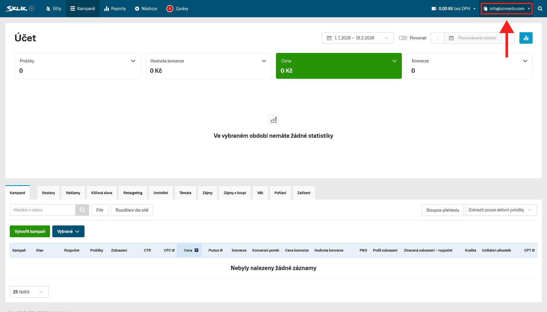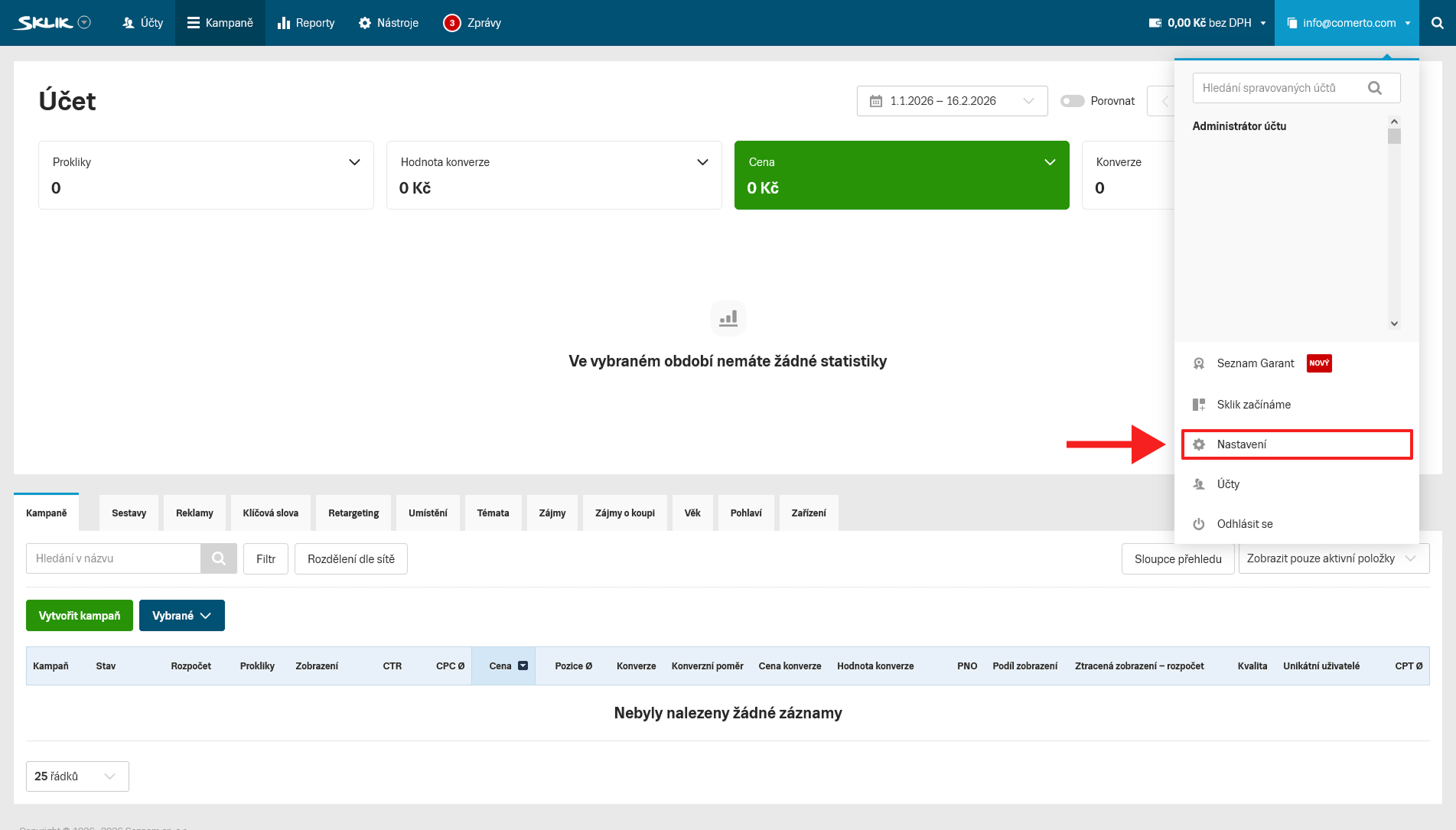 - Přihlaste se do svého účtu na adrese https://www.sklik.cz.