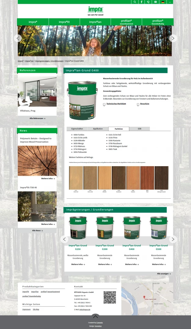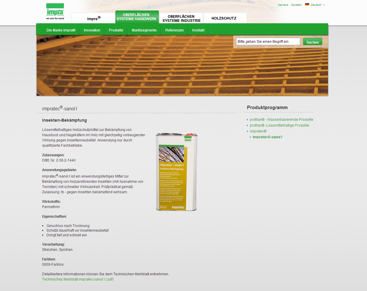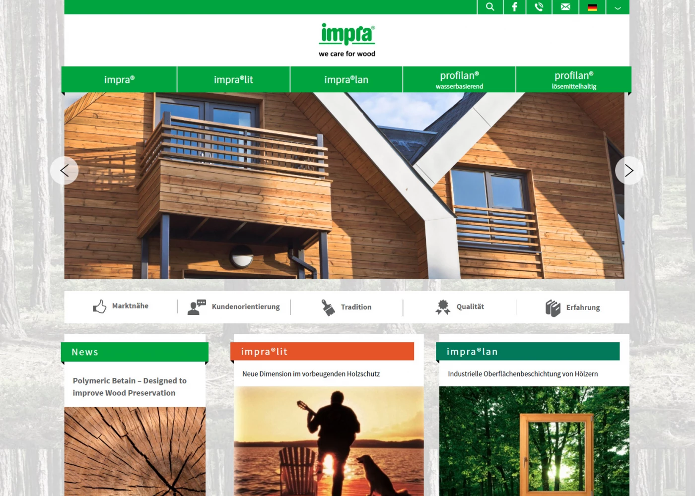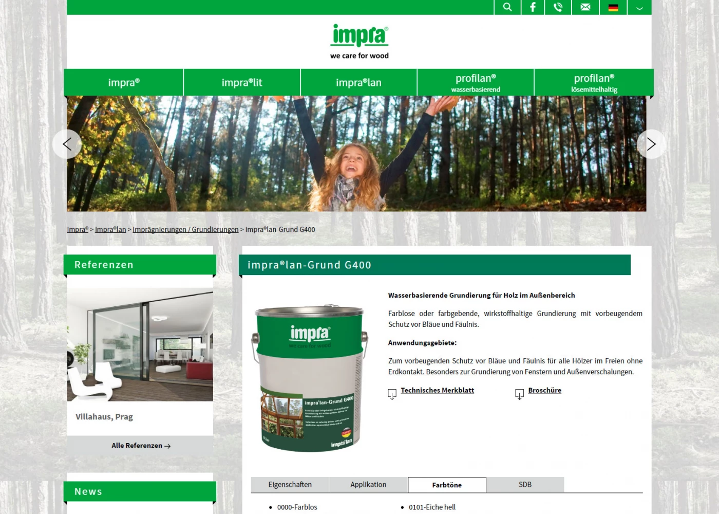 Zelená barva byla grafickým manuálem zadavatele definována jako stěžejní, a to i s ohledem na logo společnosti. Jedná se o produkty pro ochranu a ošetřování dřeva – proto tedy spojení zelené barvy z loga se dřevem/přírodou. Design webu je konzervativní a decentní – má ukázat stabilitu, sílu a technické zaměření společnosti. Z důvodu typologie německých zákazníků preferujících tradiční hodnoty nebyla grafika koncipována jako výstřední nebo extrémně originální.