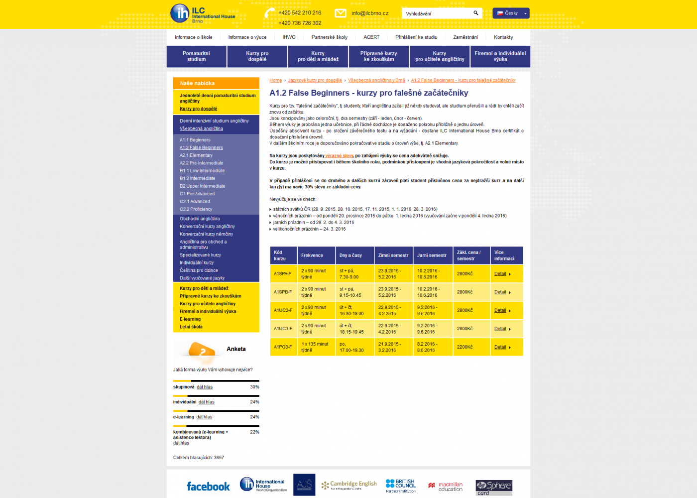 Parametry katalogu kurzu vynášené ze sdílené databáze: kód kurzu, jazyk, pokročilost, frekvence, dny a časy výuky, zaměření, začátek a konec výuky (semestry), základní cena, aktuální cena (po zahájení kurzu, snižující se úměrně odučeným lekcím nebo v závislosti na datu), atd.