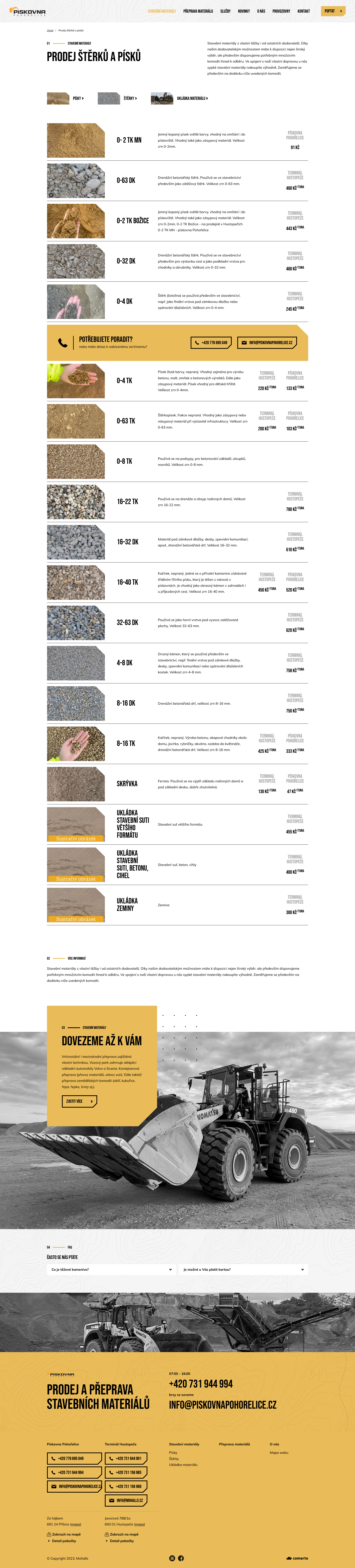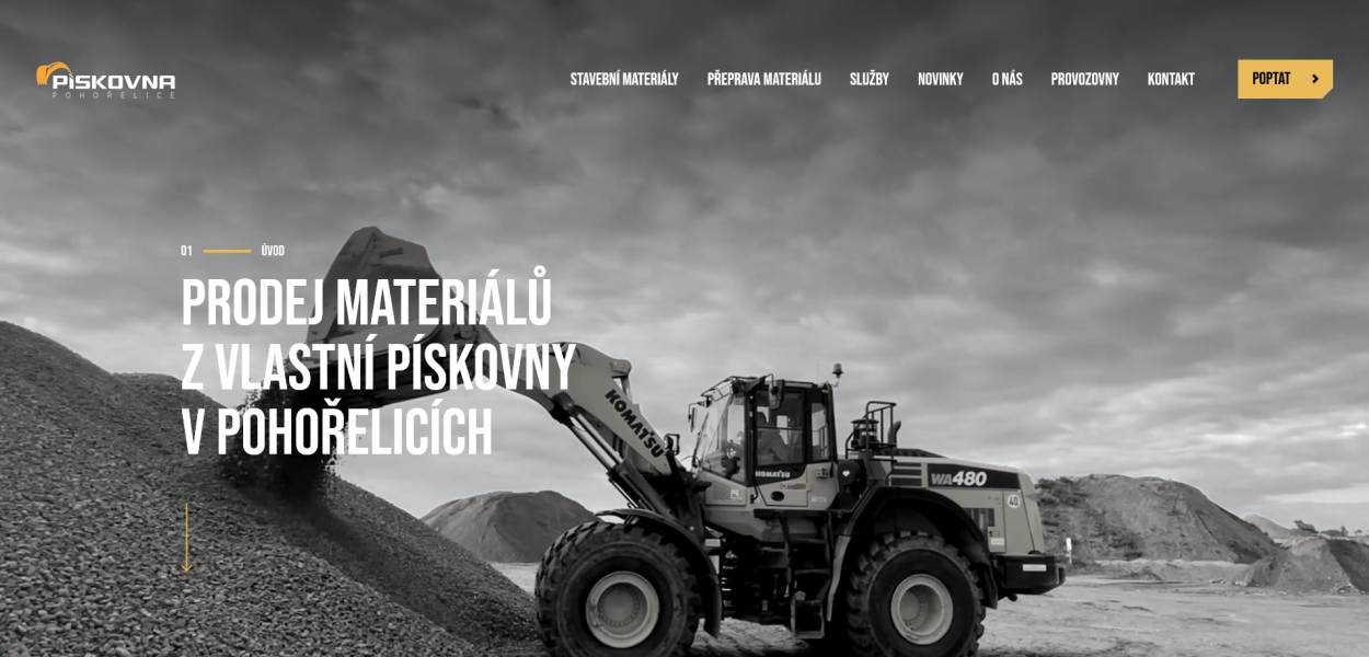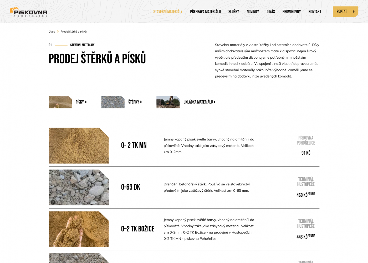 Grafik následně zpracoval grafický návrh na míru pro homepage, podle které se pak určuje ráz celého webu. Jakmile ho jednatelé společnosti Pískovna Pohořelice odsouhlasili bez výhrad, grafik doplnil i ostatní typové stránky, čímž jsme ukončili jednu z částí tvorby nového webu. V grafickém návrhu jsme kombinovali barvy z logo manuálu s akcentem na písečnou žluto-hnědo-zlatou. Kladli jsme důraz především na moderní a čistý vzhled, přehledné a funkční uživatelské rozhraní a co největší jednoduchost při poptání materiálů a služeb.
