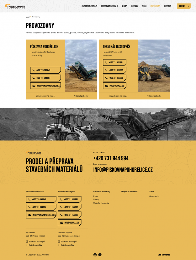 Graficky připravené webovky v tento moment trochu připomínají šablonu, do které je ještě potřeba vložit klíčové informace. K tomu nám mnohdy slouží moduly na míru, které naplníme obsahem od klienta. Pro Pískovnu Pohořelice jsme jich naprogramovali rovnou několik, např. pro výpisy a detaily produktů či poboček. Díky modulům se třeba produktový katalog může na pár kliknutí zobrazovat na vícero stránkách.